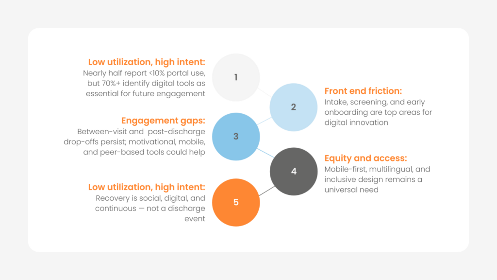 A: Five key themes have emerged that paint a picture of where behavioral health engagement is heading: 1) low utilization but high intent; 2) friction at intake; 3) persistent engagement gaps; 4) the need for equity and access; and 5) redefining recovery. Together, these themes point toward a future that is continuous, personalized, and relationship driven.